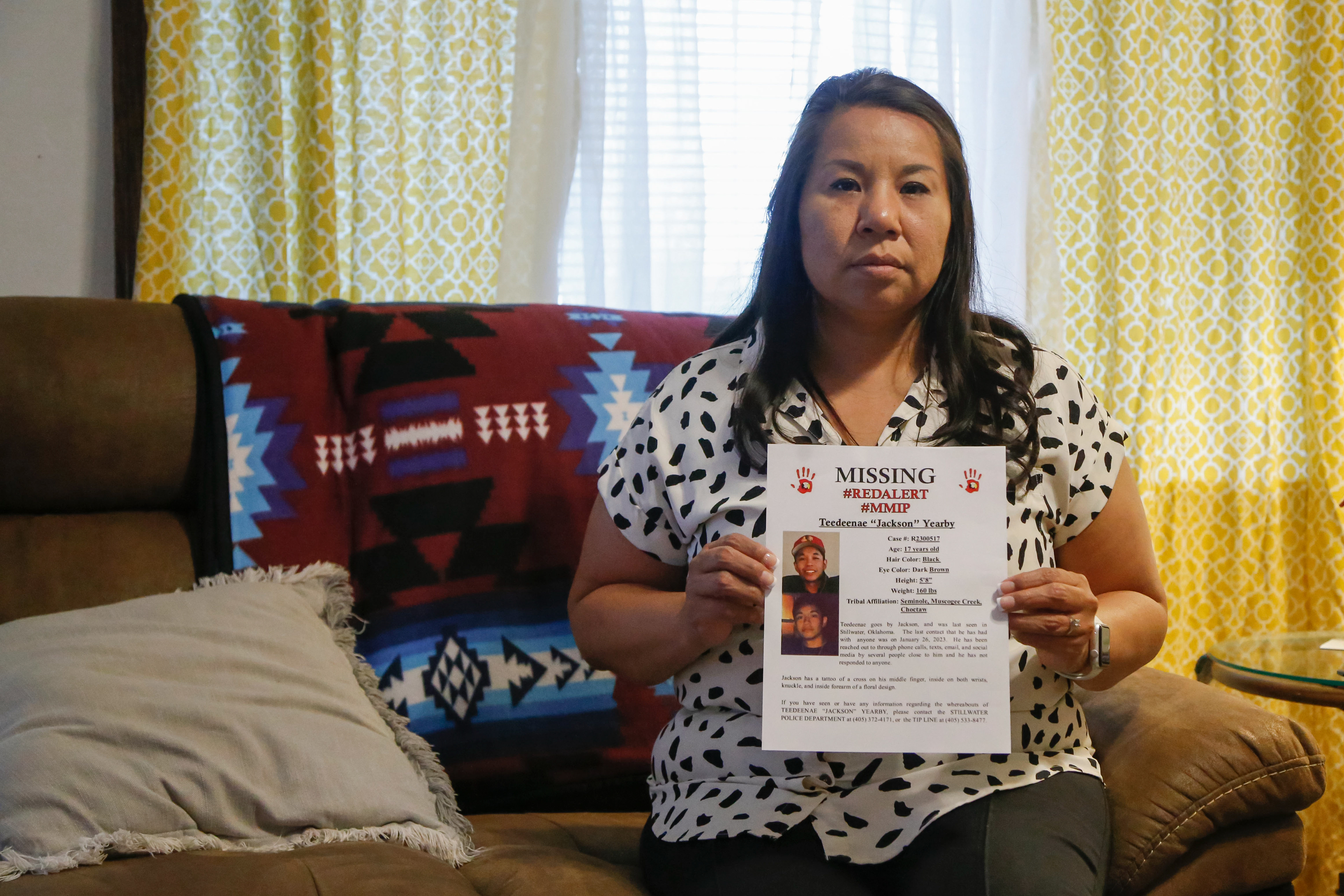 Shema Lincoln poses for a portrait with her son’s missing persons flier in her home Friday, June 23, 2023 Stillwater, OK